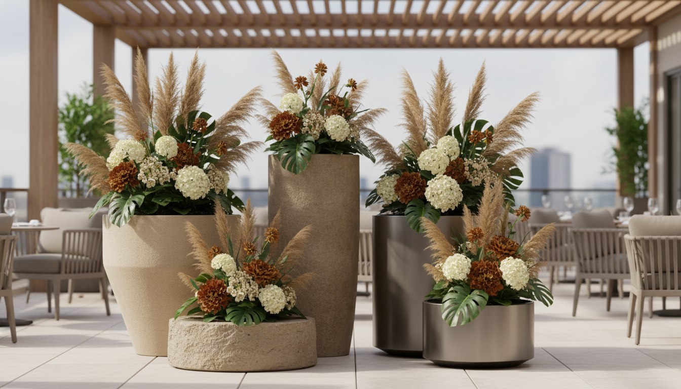 Сезонные цветочные композиции активно применяются в проектах контейнерного озеленения террас, где важно поддерживать привлекательный внешний вид пространства в течение всего сезона.