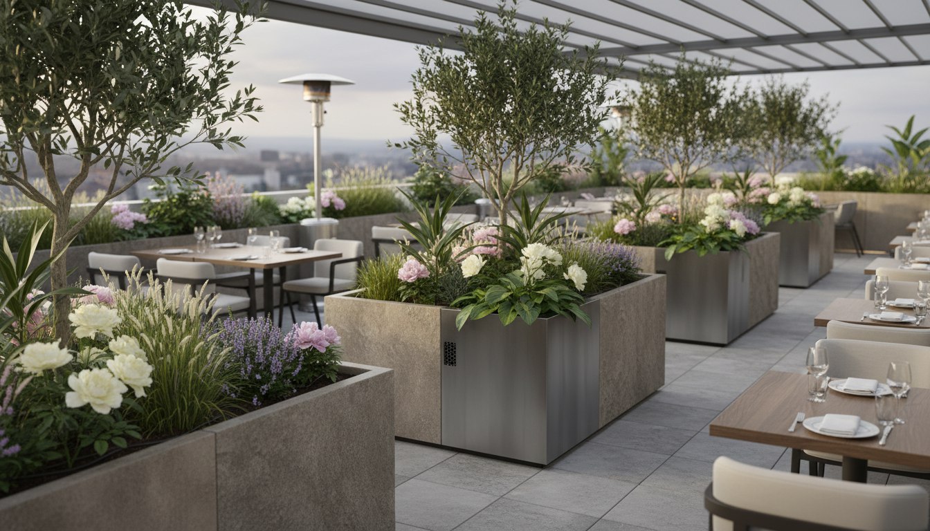 В проектах с высокой нагрузкой — на террасах, в ресторанах и общественных пространствах — автополив становится не дополнительной опцией, а необходимым элементом. Он обеспечивает равномерное увлажнение растений, снижает риск пересыхания или перелива и позволяет сохранять декоративность композиций в течение всего сезона.