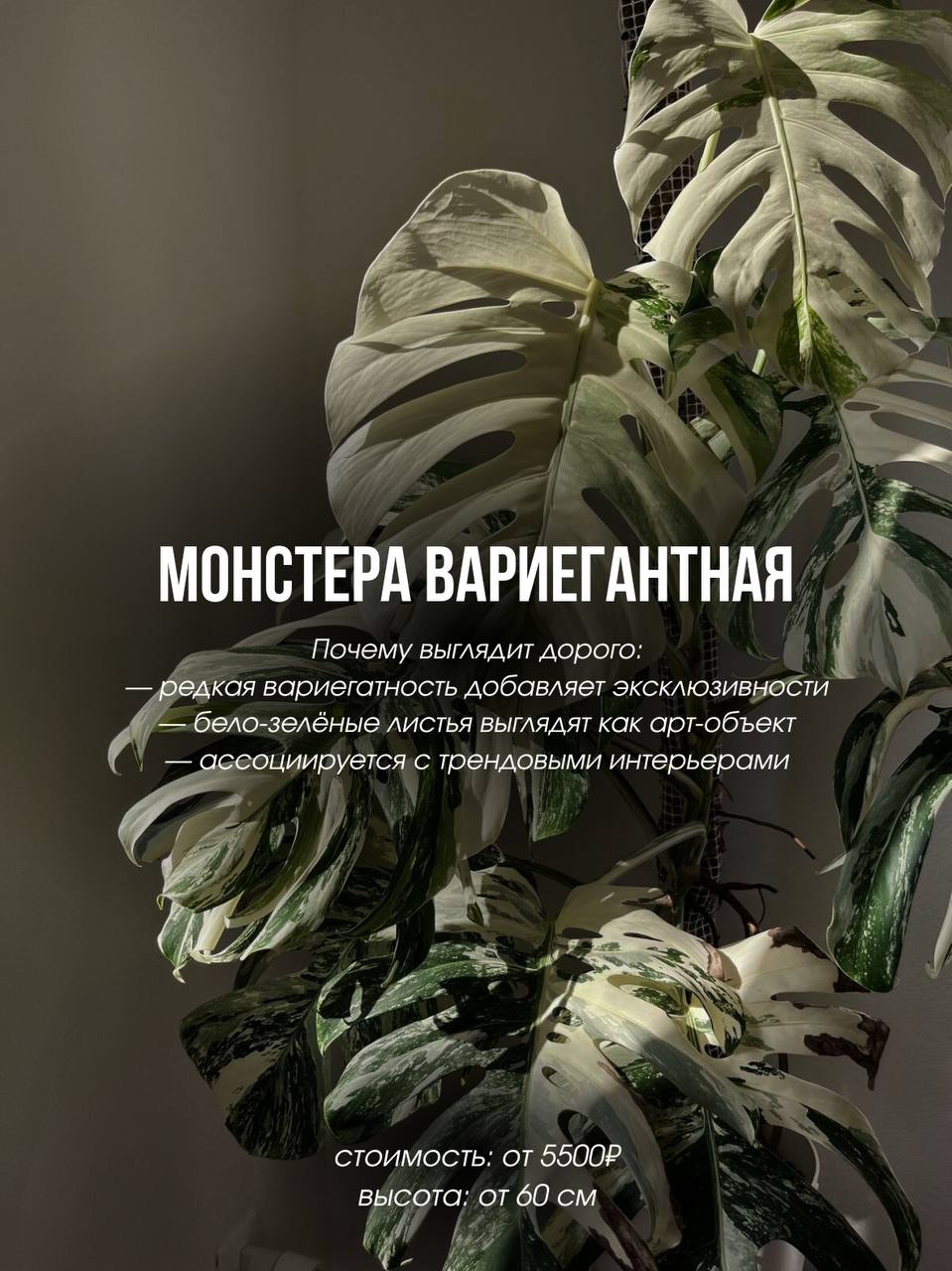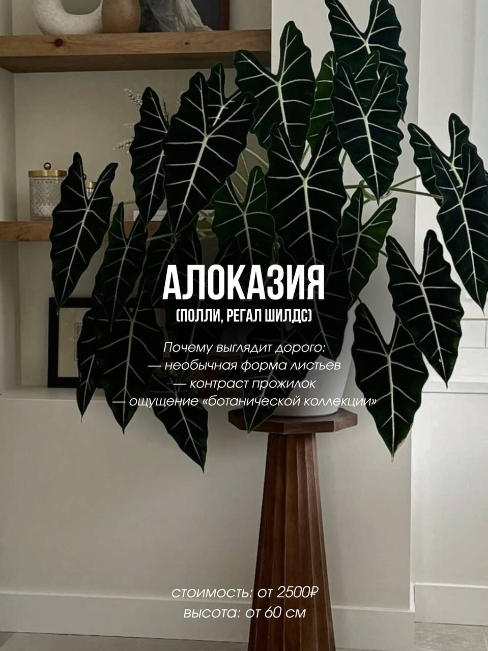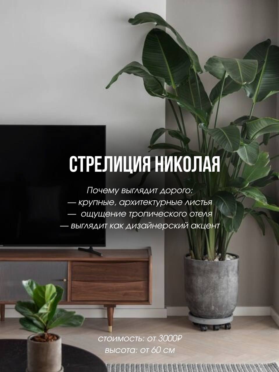 Крупные растения воспринимаются иначе: они не теряются в интерьере, формируют фокус внимания и визуально «держат» пространство. Например, монстера с листьями до 1,5 метра сразу становится доминирующим элементом и формирует атмосферу вокруг себя . Аналогично работают и другие крупные формы — они создают ощущение масштаба и продуманности.